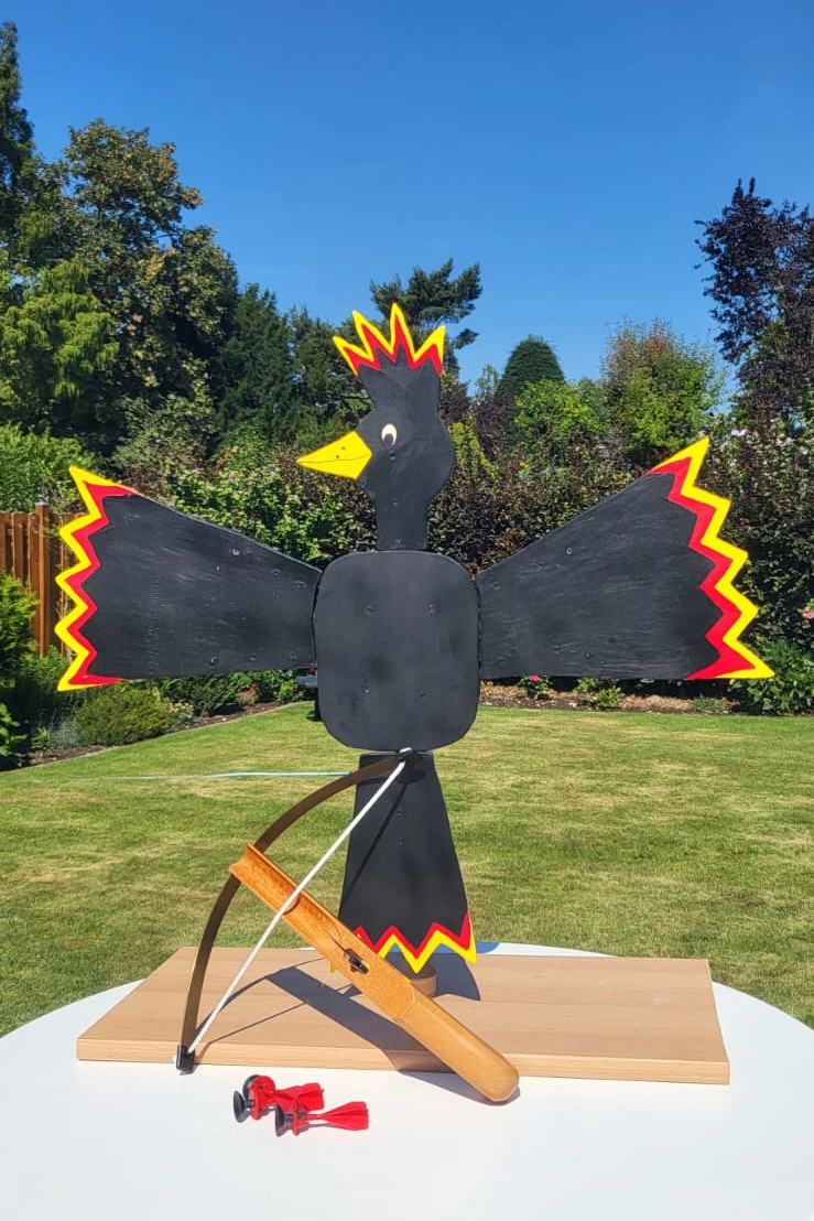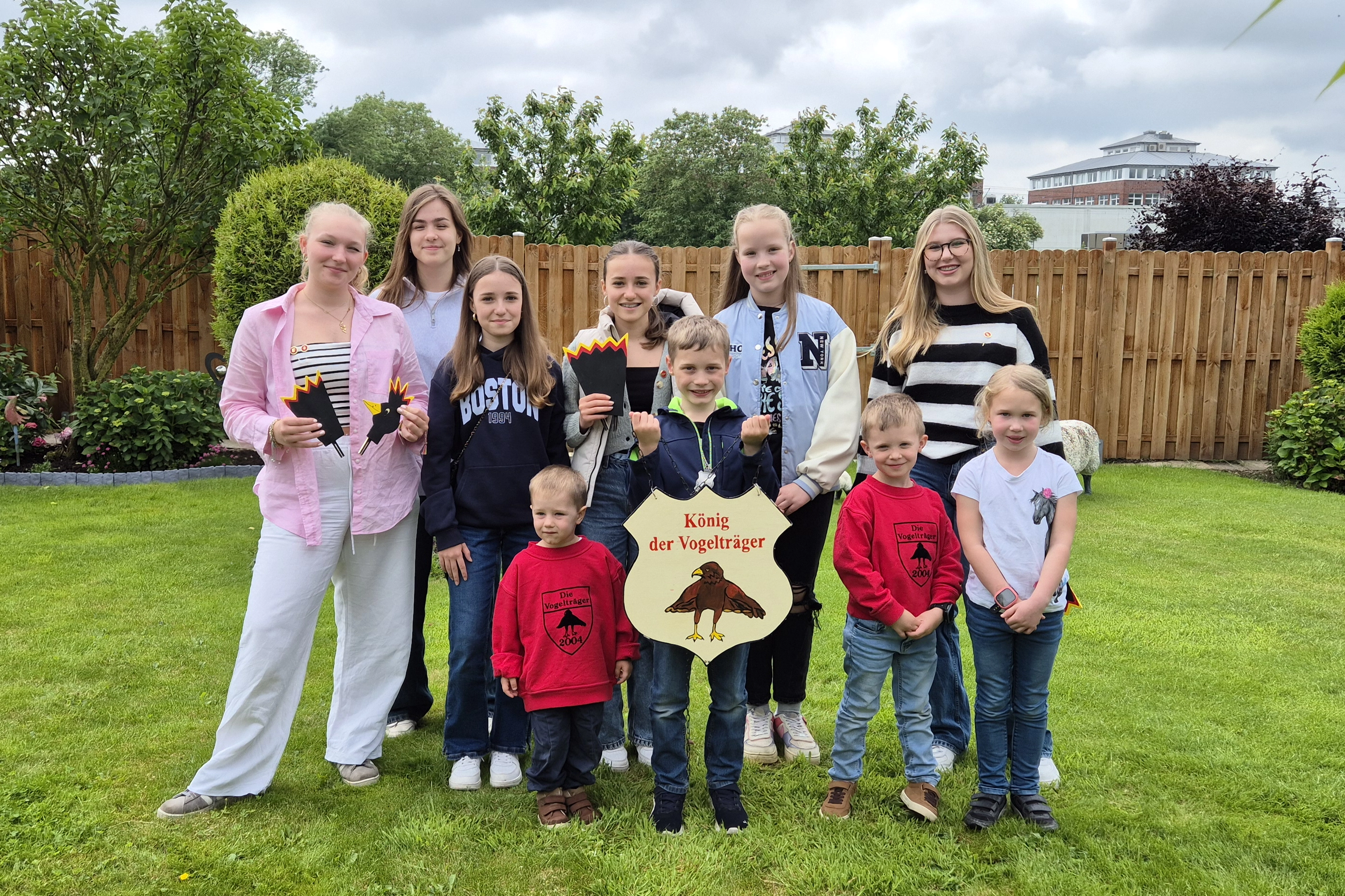 Am Samstag nach Pfingsten trafen sich die Vogelträger, um ihren König oder ihre Königin zu ermitteln. Da einige Vogelträger aus sportlichen bzw. familiären Gründen verhindert waren, erhöhte sich die Chance der anwesenden Vogelträger die Königswürde zu erlangen. Beherzt schossen selbst die beiden jüngsten Mitglieder Pepe und Mattheo Radmacher mit der Armbrust auf den schwarz – rot – gelben Vogel. Und es dauerte nicht lange bis Jessika Girich mit dem 28. Schuss den rechten Flügel und gleich darauf mit dem 29. Schuss Mirja Ziebert den linken Flügel abschossen. Und auch in diesem Jahr gelang es Hermine Vits wiederum zwei Pfänder für sich zu holen. Mit dem 43. Schuss traf sie den Schwanz und mit dem 44. Schuss den Kopf unseres Vogels. Übrig blieb der Rumpf. Jetzt wurde noch mal der Ehrgeiz besonders bei den jüngeren Vogelträgern geweckt, die alle gerne den Vogel von der Stange holen wollten. Stefanie, Sophia, Mattheo, Jessika, Pepe und Clara trafen zwar den Rumpf, aber er wollte einfach nicht fallen. Jetzt war Niklas dran. Erster Schuss daneben. Dann konzentrierte er sich und mit seinem zielsicheren zweiten, dem 198. Schuss fiel der Rumpf und die Vogelträger hatten einen neuen König.