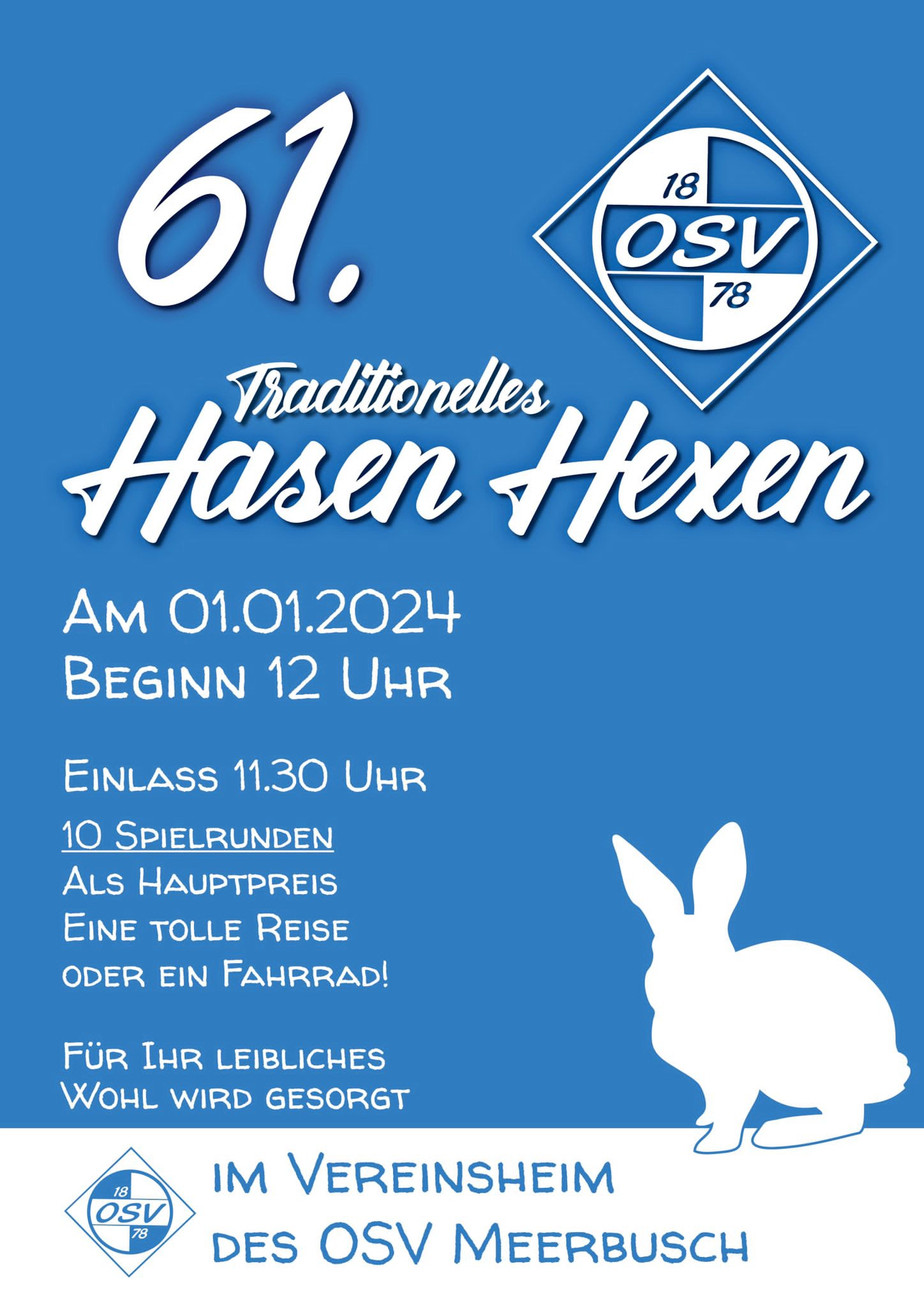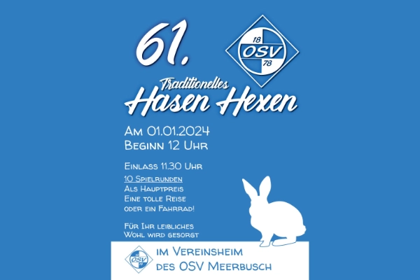 29.12.2023 | Im neuen Jahr veranstaltet der OSV wieder das traditionelle Hasen Hexen. Einlass ist ab 11.30 Uhr. Es gibt tolle Preise zu gewinnen und natürlich ist für das leibliche Wohl gesorgt.
