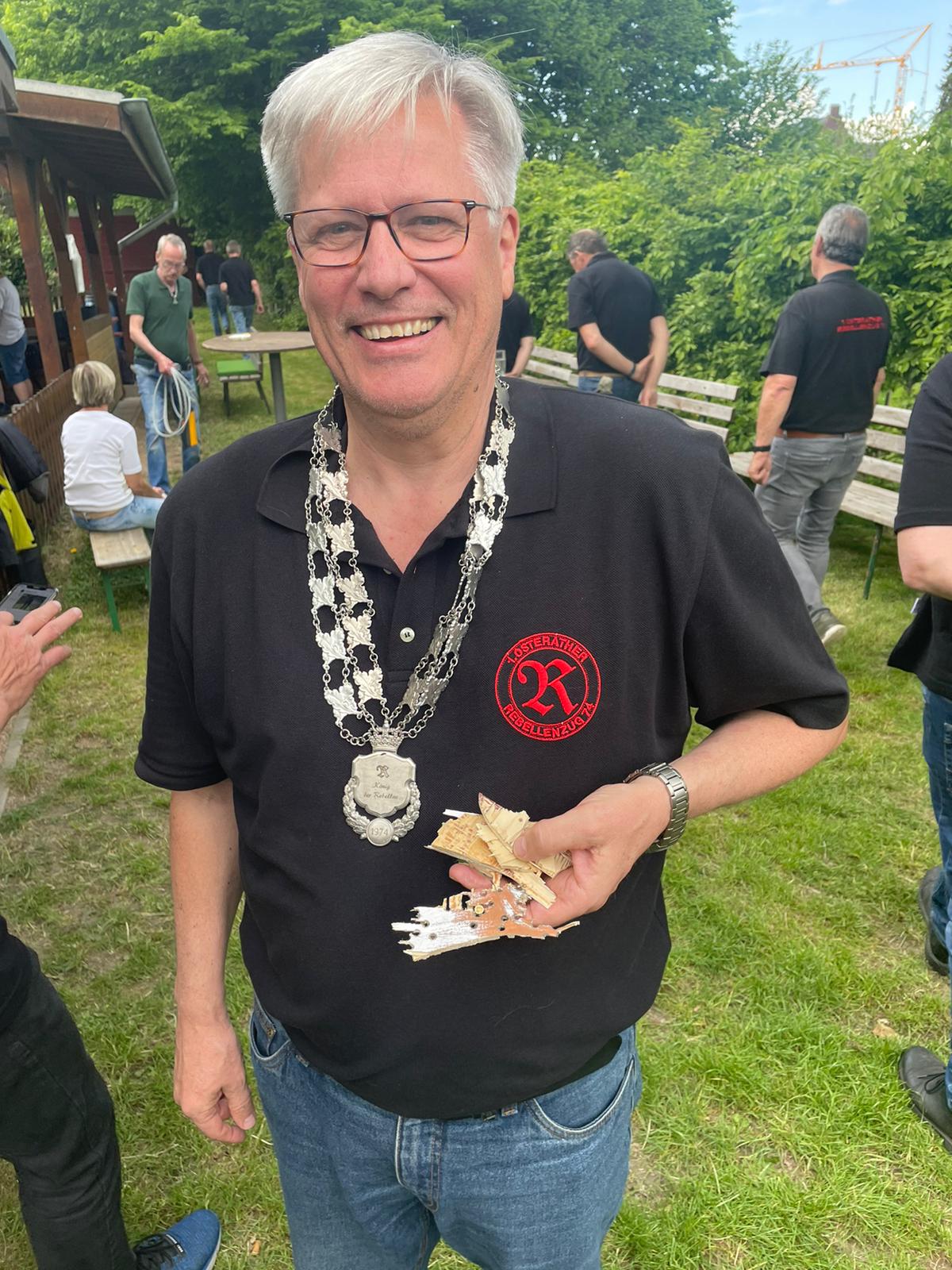 Die scheidende Majestät, Robert I. Schramm, wurde für seine 3 jährige Regentschaft verabschiedet und erhielt traditionell den Königsorden für seine Regentschaft von 2019 bis 2022. Nachdem die Pfänder geschossen waren, holte Major Klaus Telders mit dem 413. Schuß den Vogel von der Stange. Diese Königswürde hatte er bereits im Jahr 2001 schon einmal erworben. Er regiert mit seiner Ehefrau Monika bis 2023.